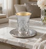 Unit price perThe “Elior” Kiddush set combines refined geometric engraving on the cup with a matching plate, creating a harmonious and luxurious presentation. The cup features a striking diamond-pattern design, paired with an elegantly detailed plate that completes the look. Its gold-plated interior delivers a warm, ceremonial glow with every pour, making this set a distinguished choice for those who appreciate fine craftsmanship.