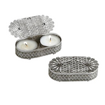 A refined handcrafted sterling silver 925 tea-light holder featuring an oval structure with a wide filigree floral lid. The body is decorated with delicate lace engraving, housing two tea-light compartments arranged neatly within.
