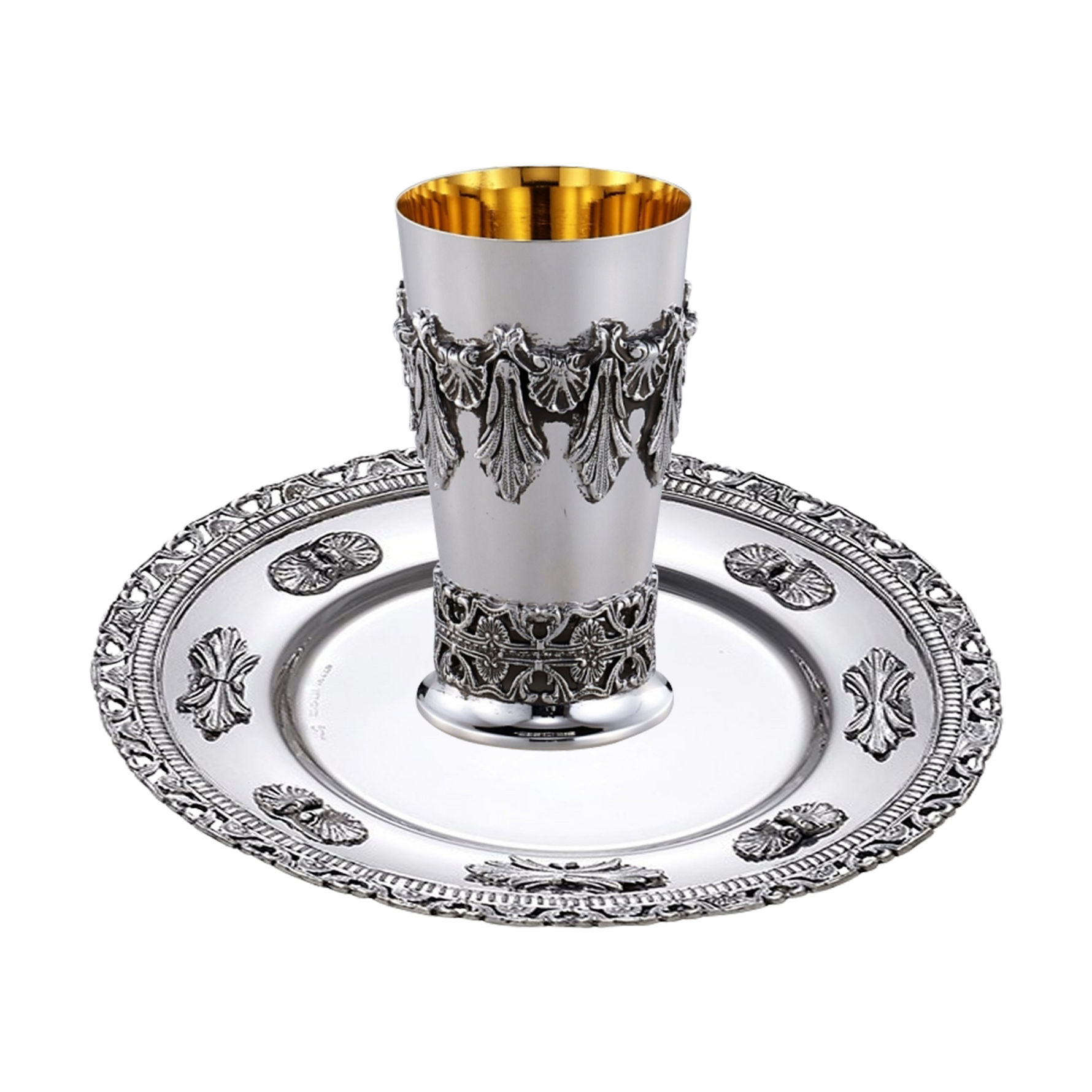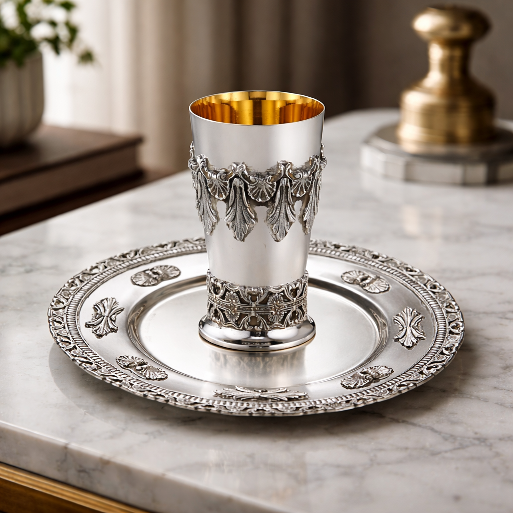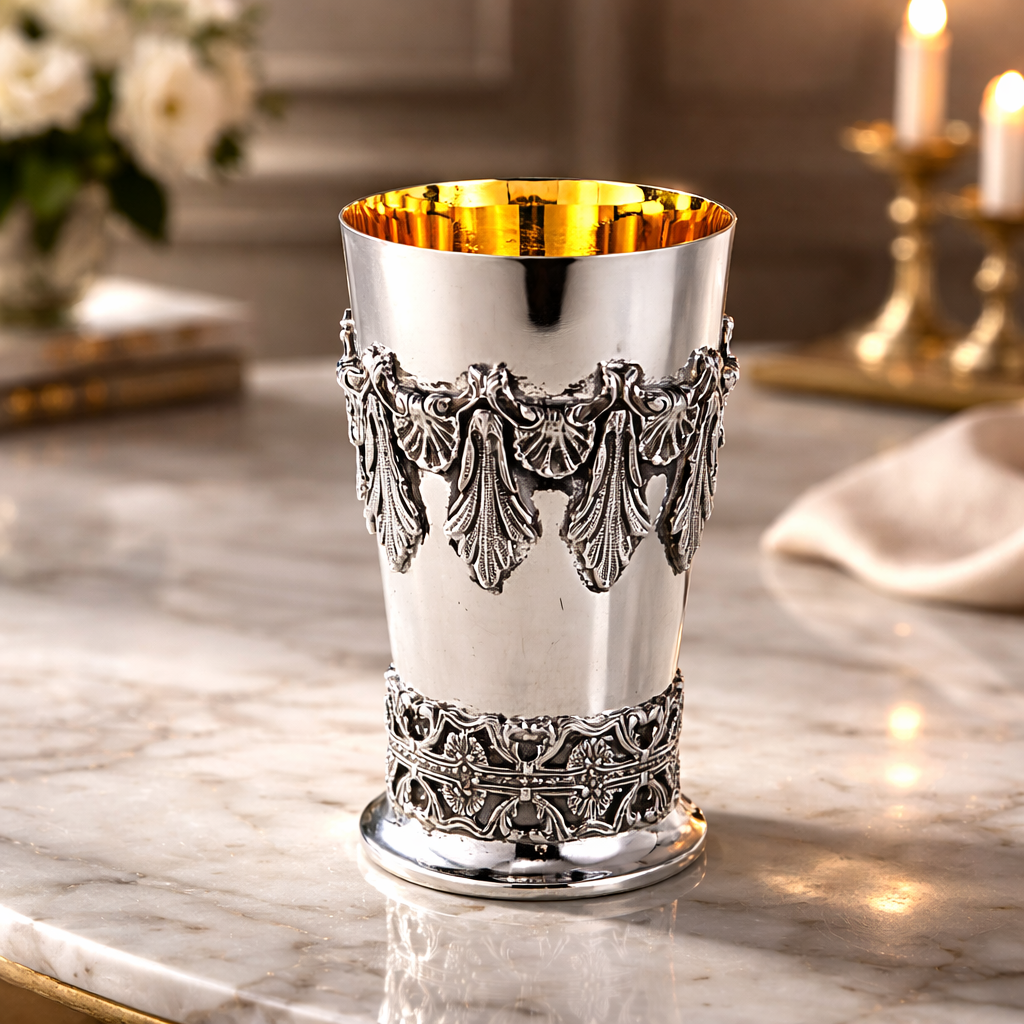 An elegant Kiddush cup, harmonizing soft lines and precise proportions. Its intricate ornamentation serves as a reminder of ancient traditions, granting it a unique presence. A polished finish distinguishes this piece as a luxurious addition to any festive table.